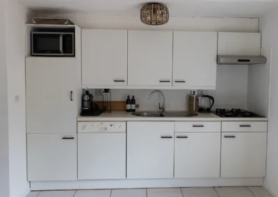 De complete en moderne open keuken beschikt over veel opbergruimte (kastjes en lades), ruim werkblad en uitgebreide keukenapparatuur zoals een vaatwasser, 4 pits gaskookplaat, afzuigkap, elektrische oven / magnetroncombinatie en een koelkast met een apart vriesvak.